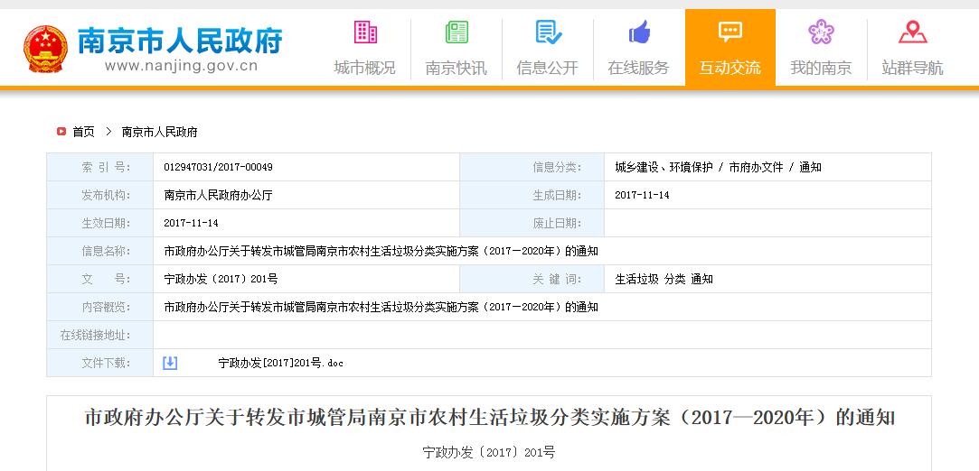 日前,市政府办公厅关于转发市城管局南京市农村生活实施方案(2017—2020年)的通知。全文如下:市政府办公厅关于转发市城管局南京市分类实施方案(2017—2020年)的通知宁政办发〔2017〕201号各区人民政府,市府各委办局,市各直属单位:市政府同意市城管局拟定的《南京市农村生活垃圾分类实施方案...