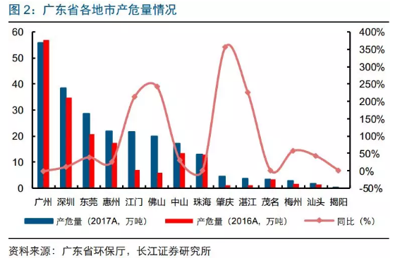 2017年广东省危废产量约232万吨,同比增31%,可获得数据的14个地市中除了广州略微下降,剩下地市产危量都出现不同程度的增加,其中肇庆/佛山/湛江/江门增速靠前,分别达到356%/242%/225%/212%。