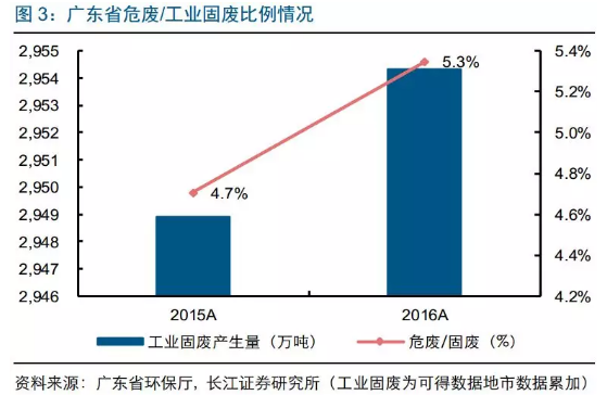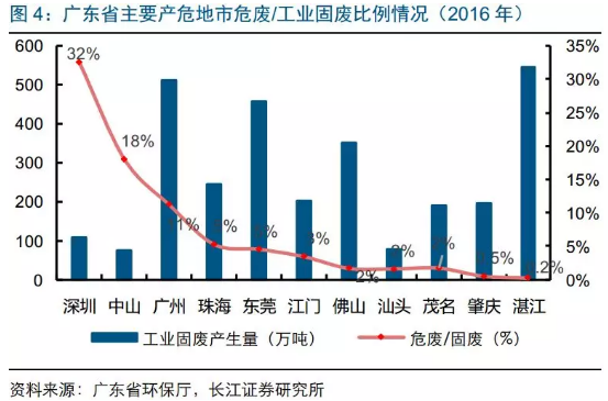 2015-2016年广东省危废占一般工业固废的比例分别为4.7%及5.3%,其中深圳(32%)、中山(18%)、广州(11%)、东莞产危量占一般工业固废比例均超过5%,根据发达国家经验,该比例均值为3%,考虑到深圳、中山、广州、珠海等地工业行业以产危比例较高的基础化工、电子、石化为主,因此产危比例超过3%情理之中。其他地区比例较低或存低估可能,例如东莞、江门、佛山产业结构与深圳、珠海、中山相差无几,茂名以石油开采为主,会产生大量的含油污泥,但其系数并没体现。