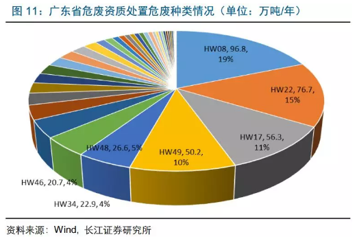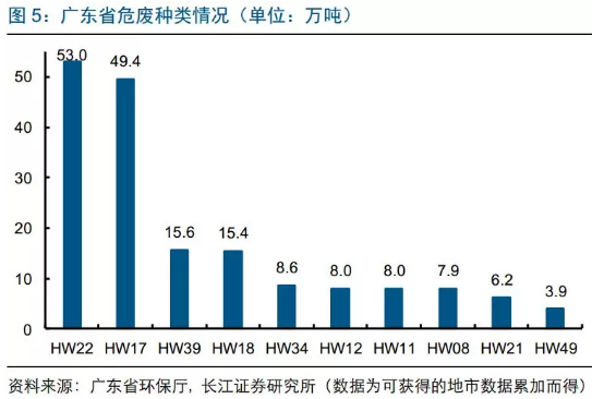 广东省危废种类中前5位的HW08(含油污泥,96.8万吨,占总资质的20%)/HW22(含铜废物,76.7万吨,占总资质的15%)/HW17(表面处理污泥,56.3万吨,占总资质的11%)/HW49(其他废物,50.2万吨,占总资质的10%)/HW48(有色金属冶炼废物,26.6万吨,占总资质的5%)合计占总资质61%,危废资质种类集中度高。