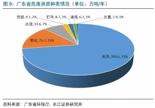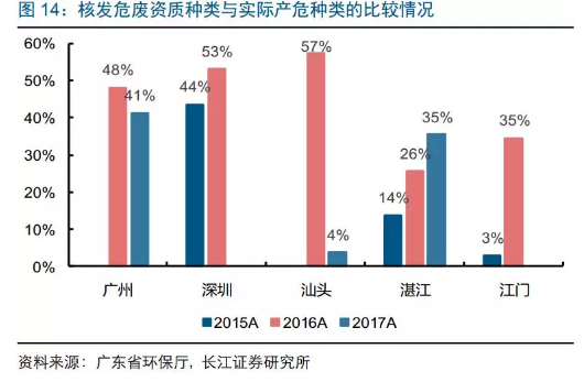 广州市危废资质最齐全,物化最大(63万吨),占本市资质总量的55%;
