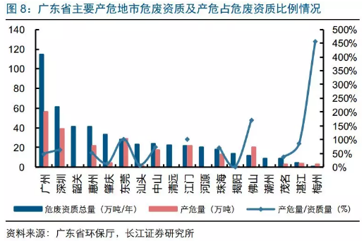 梅州/佛山/东莞/江门危废产生量大于危废资质量(比例分别为457%、171%、102%、101%),危废处置产能供给相对紧张;(危废中国资讯公众号:chinawaste)