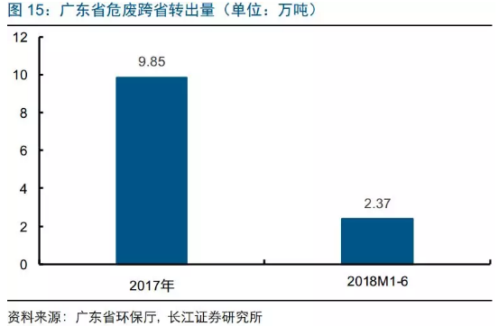 2017年广东省跨省转出危废量9.85万吨(占广东省产危量的4.2%),2018年前6个月跨省转出2.37万吨。从接受省份来看,湖南、安徽、江西占比较高,三省合计接收广东危废6.76万吨,占广东转出危废量的68.6%。