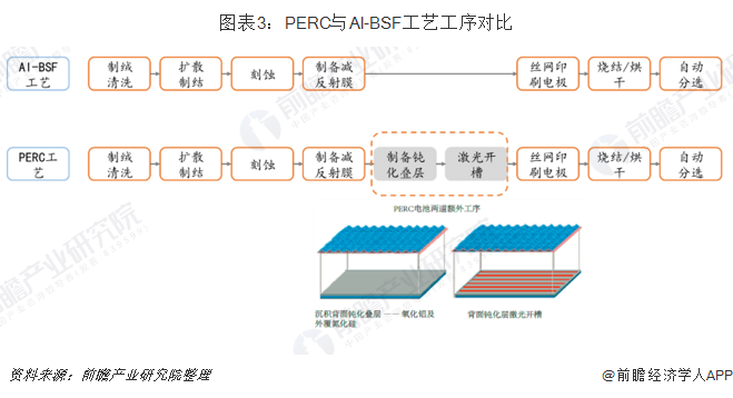 PERC工艺主要在常规电池生产工艺中增加了两道额外工序,一是沉积背面钝化叠层(增强背面钝化反射能力),二是背面钝化层激光开槽(打通钝化叠层形成电学通路)。PERC电池不需要另开生产线,在常规电池生产流程中增加两道工序即可完成升级,需要增加的设备是背部钝化设备(PECVD)和激光开槽设备。