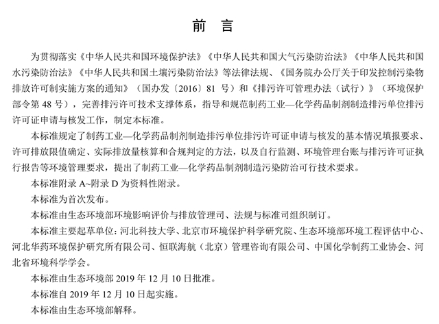 为贯彻落实《中华人民共和国环境保护法》《中华人民共和国大气污染防治法》《中华人民共和国水污染防治法》《中华人民共和国土壤污染防治法》等法律法规、《国务院办公厅关于印发控制污染物排放许可制实施方案的通知》(国办发〔2016〕81号)和《排污许可管理办法(试行)》(环境保护部令第48号),完善排污许可技术支撑体系,指导和规范制药工业—化学药品制剂制造排污单位排污许可证申请与核发工作,制定本标准。