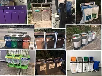 在公共场所,倒是可以见到成组的分类垃圾桶。有的很简单,只分为可回收物和不可回收垃圾;有的则把可回收物又细分为纸、玻璃、塑料等不同类别,所以我们每次扔垃圾都要仔细看清标识才能投放。