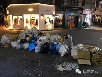 更有意思的场景是在入夜后的首尔街头。一家家店铺、一户户居民,纷纷走出门,把收集好的各种可回收物堆在路边;夜里,市政的资源回收车会把它们运走。