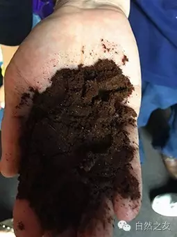 看,成品饲料就是这样的褐色细颗粒,捏起来松松软软,有点儿像肉松。