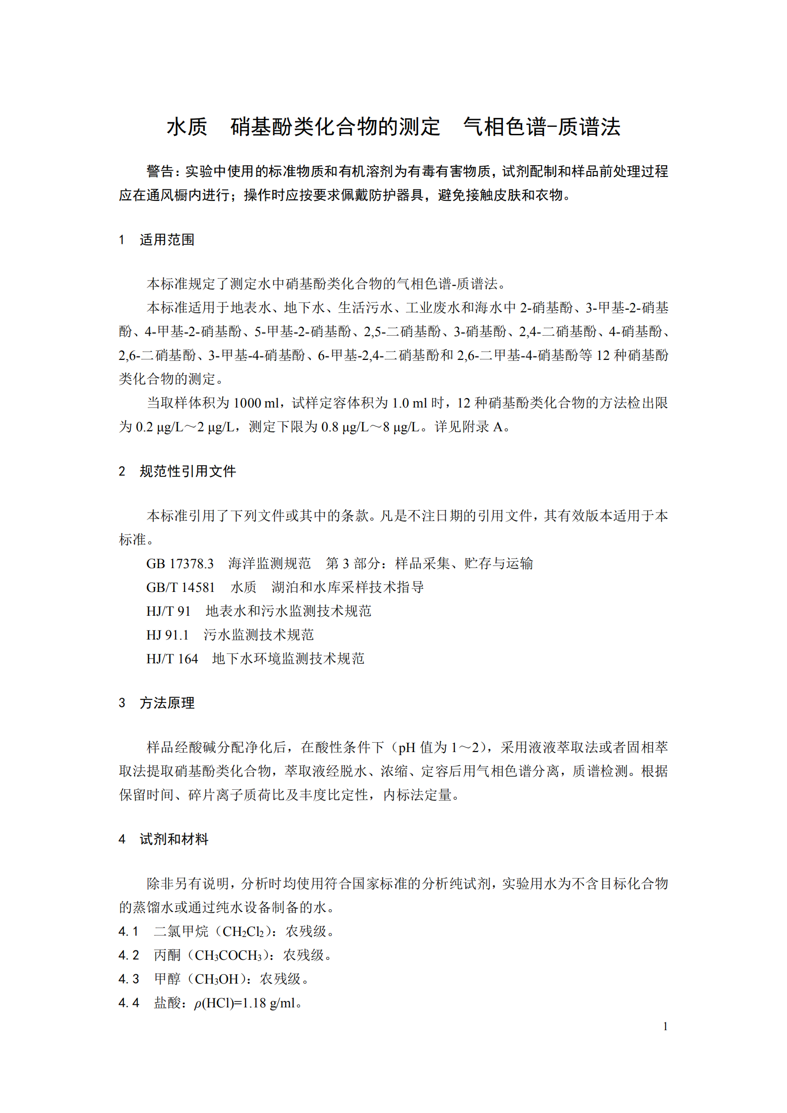 本标准规定了测定地表水、地下水、生活污水、工业废水和海水中12种硝基酚类化合物 的气相色谱-质谱法。