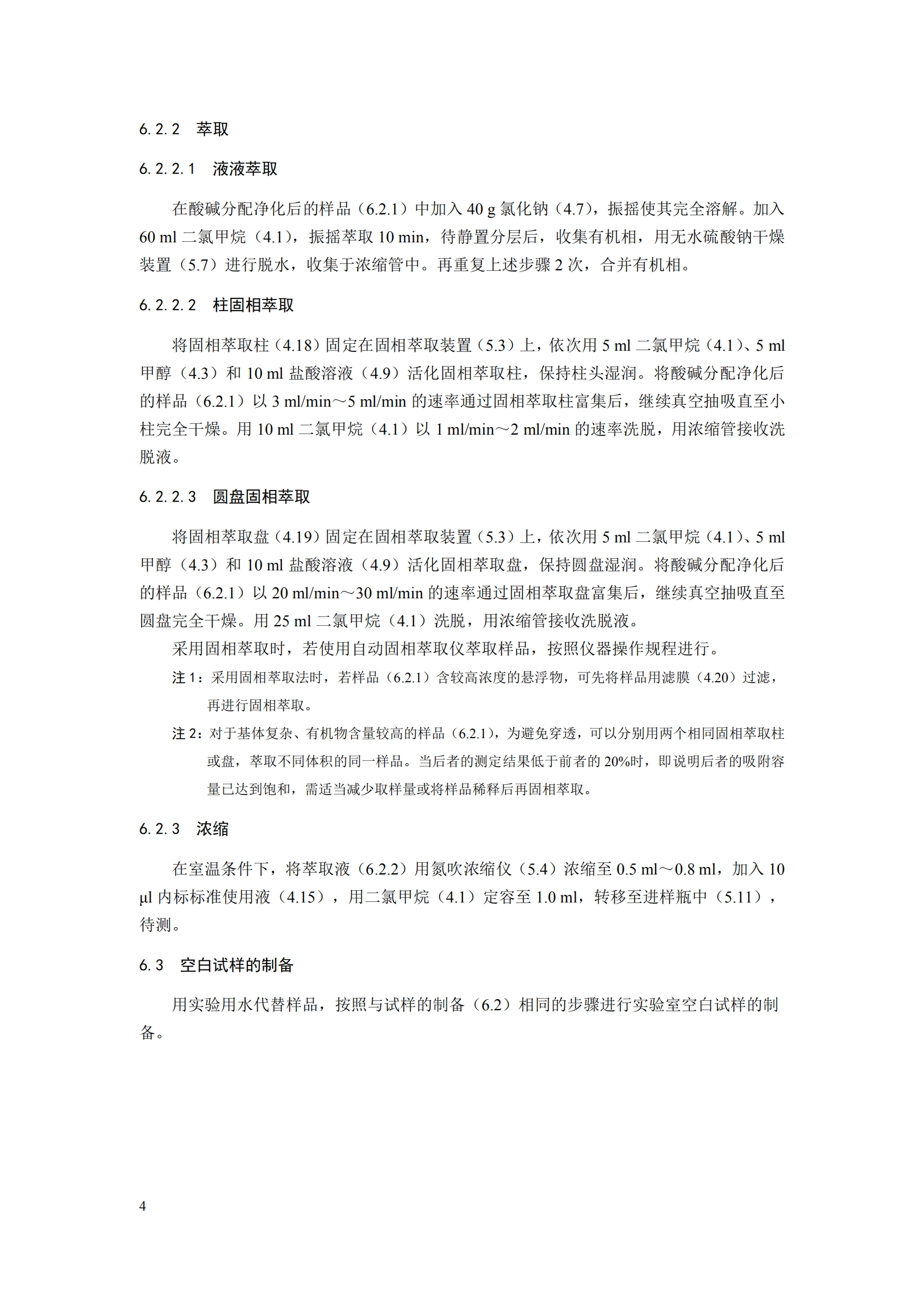 样品经酸碱分配净化后,在酸性条件下(pH 值为 1~2),采用液液萃取法或者固相萃 取法提取硝基酚类化合物,萃取液经脱水、浓缩、定容后用气相色谱分离,质谱检测。根据 保留时间、碎片离子质荷比及丰度比定性,内标法定量。