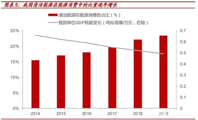 实际上,伴随政府对新能源领域的研究与使用的倡导,2014-2019 年我 国单位 GDP 能耗已经出现连续下滑,我国能源利用效率逐年增长。2019 年,我国每万元 GDP 消费 0.49 吨标准煤,较 2018 年下降 4.84%。清 洁能源在能源消费中的比重就增长至 23.4%,但传统的煤炭、石油占比 分别为 57.7%、18.9%,仍是我国主要的能源消耗来源。