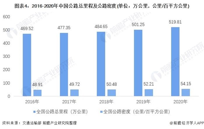 目前我国正处于经济高速发展的阶段,人口增长、城镇化率的提升使得人们对公路的需求也增加。2016-2020年,中国公路总里程及公路密度逐年上升。截至2020年末,全国公路总里程519.81万公里,比2019年增加18.56万公里。2020年我国公路密度54.15公里/百平方公里,较2019年增加1.94公里/百平方公里。