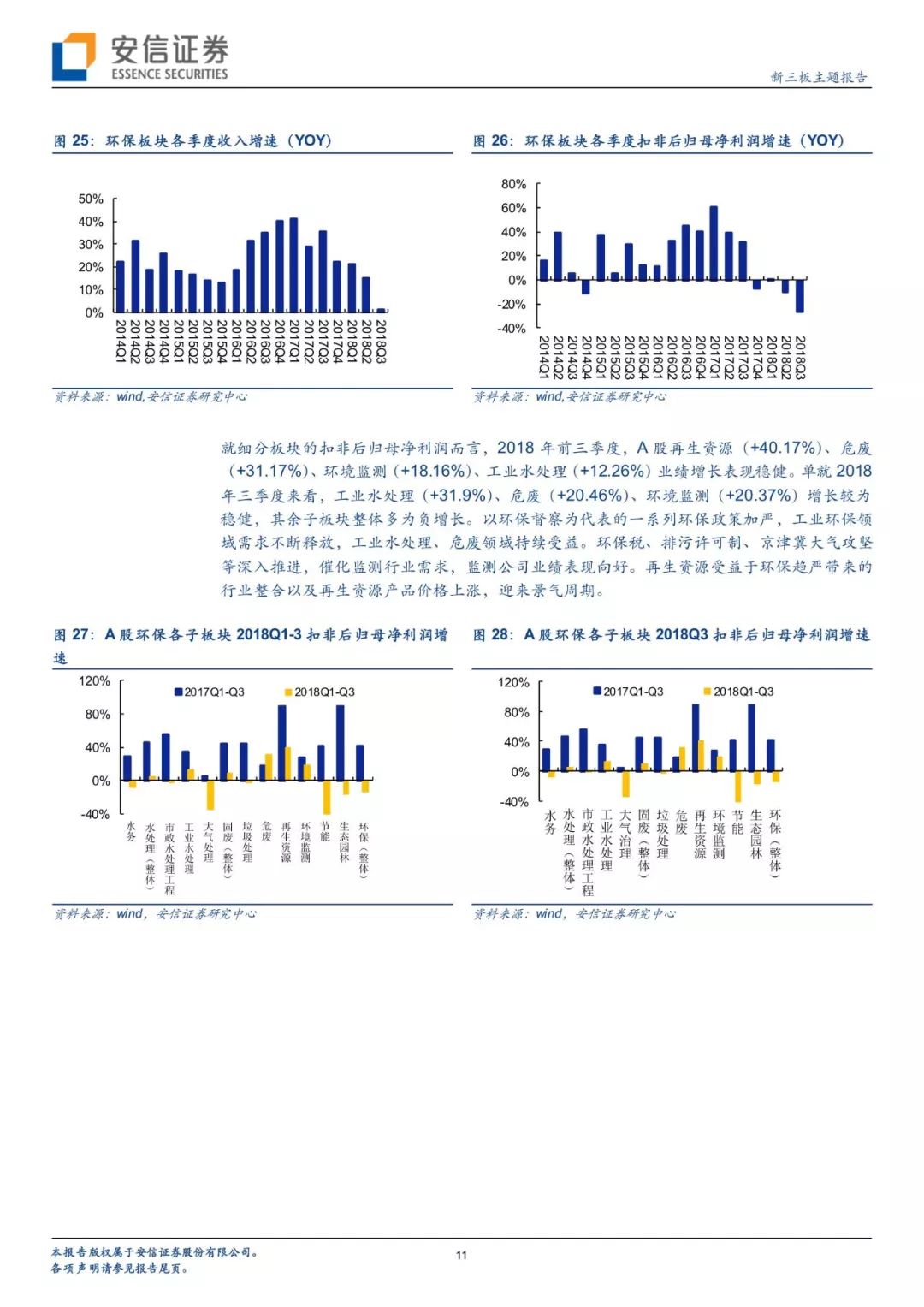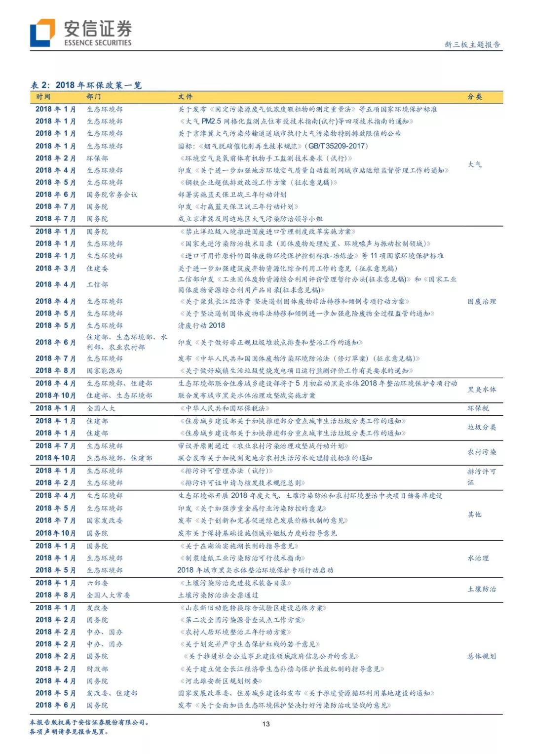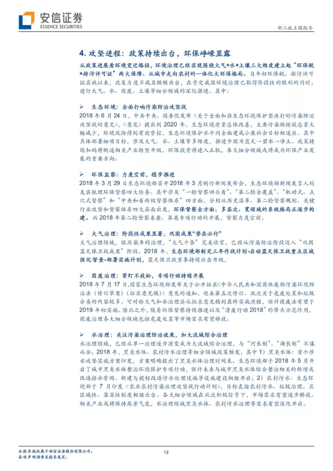 从政策进展看环境变迁路径,环境治理已经实现围绕大气+水+土壤三大维度建立起“环保税+排污许可证”两大保障、从城市走向农村的一体化大环保格局。自年初环保税、排污许可证实施以来,政策力度不减且频频出台,在肯定我国环境治理已取得阶段性的胜利的同时,进行大气、水、固废、土壤等细分领域的深化推进。我们对于2018年以来各细分板块政策及变迁进行了梳理。而新三板拥有400家公司,覆盖了大气治理、水治理、固废治理等各个领域。我们继续看好环保板块,建议从政策推进进程中发掘潜在机会,建议关注水治理、固废治理和再生资源板块投资机会。