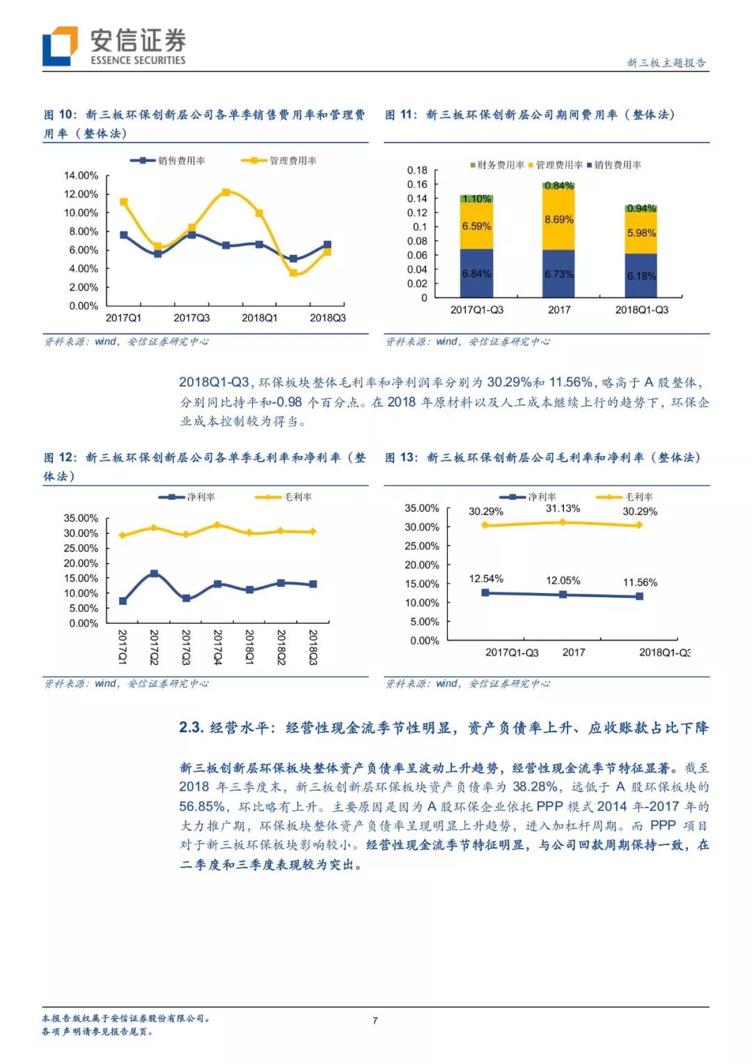 盈利能力:1)期间费用:新三板环保板块2018年前三季度销售、管理、财务费用率分别为6.18%、5.98%、0.94%,同比-0.66、-0.61、-0.16个百分点,销售、管理费用率控制得当。财务费用率低于A股环保公司(A股为2%-3%),主要原因是因为A股以PPP为主要模式,2018年以来利率信用收紧、利率继续上行。2)2018Q1-Q3,新三板环保板块整体毛利率和净利率为30.29%、11.56%,略高于A股整体,分别同比持平和-0.98个百分点。