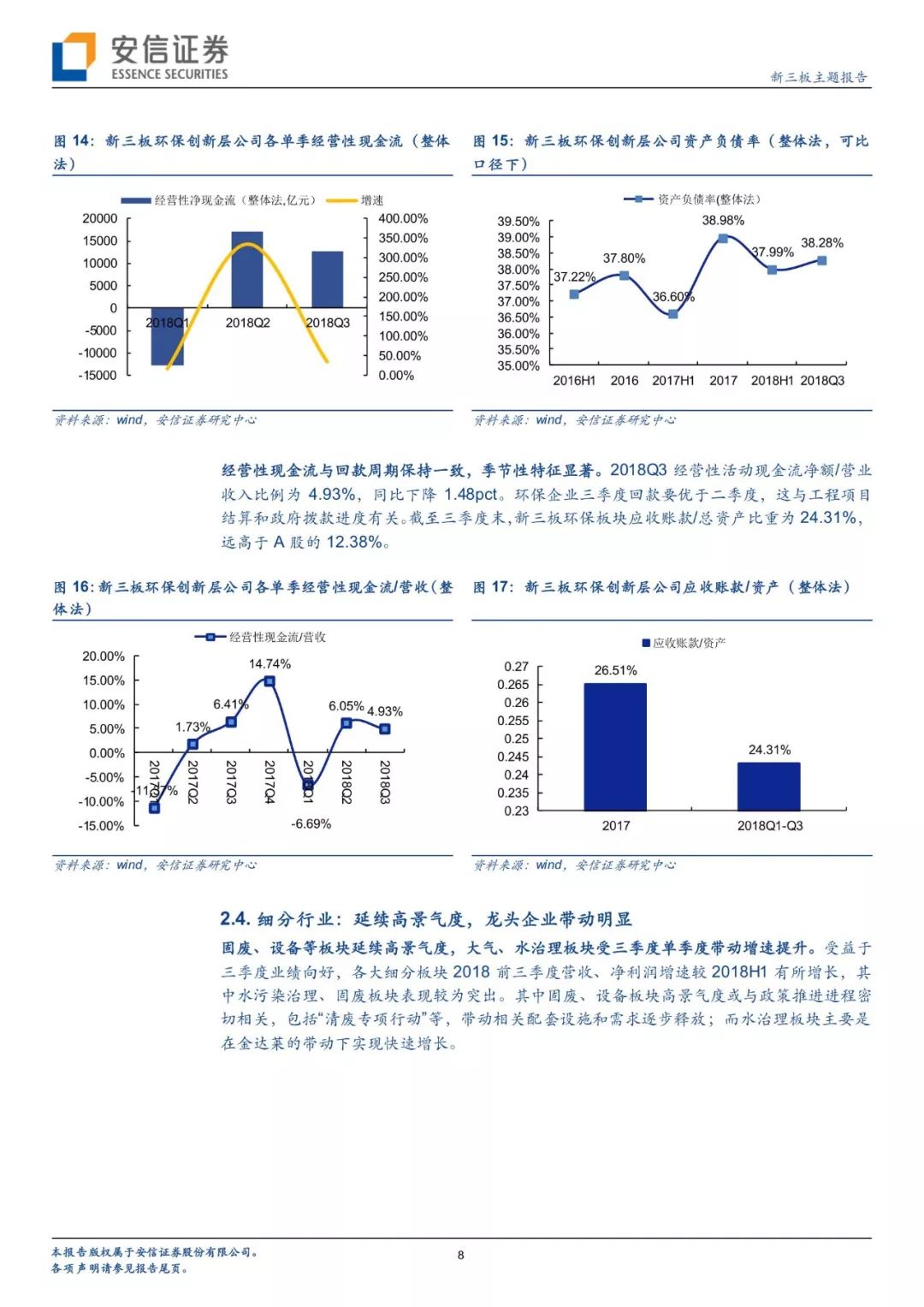 经营水平:截至2018年三季度末,新三板创新层环保板块资产负债率为38.28%,远低于A股环保板块的56.85%,主要原因是A股环保企业依托PPP模式,且2014年-2017年的大力推广期,资产负债率呈现明显上升,进入加杠杆周期,而PPP项目对于新三板环保板块影响较小。经营性现金流与回款周期保持一致,季节性特征显著。2018Q3经营性活动现金流净额/营业收入比例为4.93%,同比下降1.48pct。环保企业三季度回款要优于二季度,这与工程项目结算和政府拨款进度有关。截至三季度末,新三板环保板块应收账款/总资产比重为24.31%,远高于A股的12.38%,主要与新三板环保企业议价能力有关。