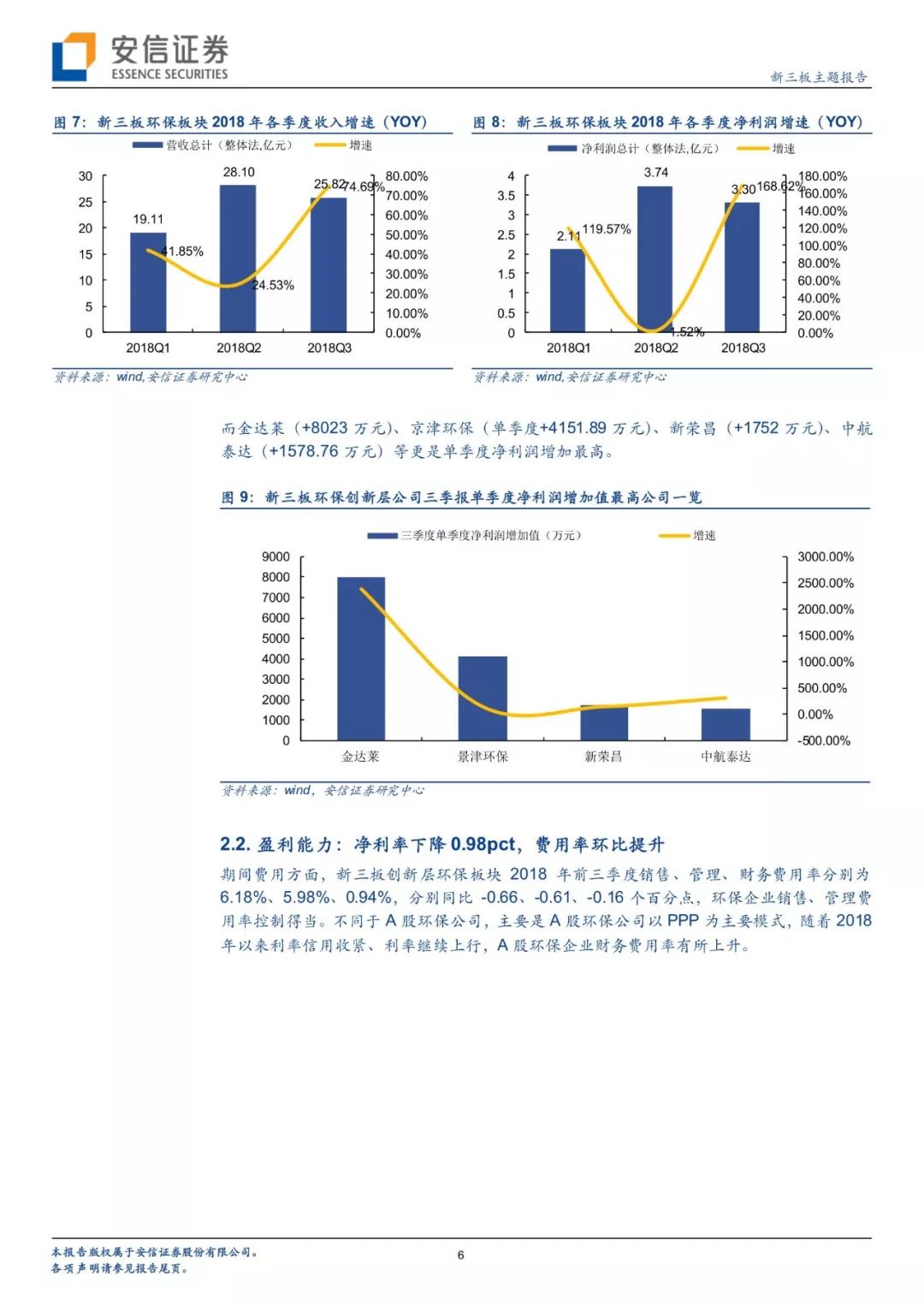 成长分析:可比口径下,2018前三季度实现营收73.04亿元(+43.71%);实现归母净利润9.16亿元(+55.84%),增速高于半年报。主要原因是环保创新层公司第三季度单季增长明显(净利润增长168.62%)。且环保创新层公司多为各细分行业的龙头,近70%环保公司实现增长,4家2018(ttm)净利润在5亿元以上,规模逐渐显现,其中不乏京津环保以及金达莱等大体量公司。
